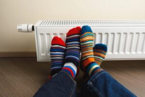 legs with colorful socks keeping warm in front of an oil heat radiator