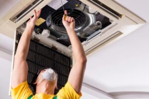 HVAC technician checking mold growth on air conditioner