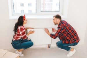 couple touching heating radiator