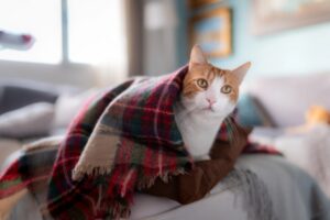 cat keeping warm indoors with a blanket and oil heat HVAC system